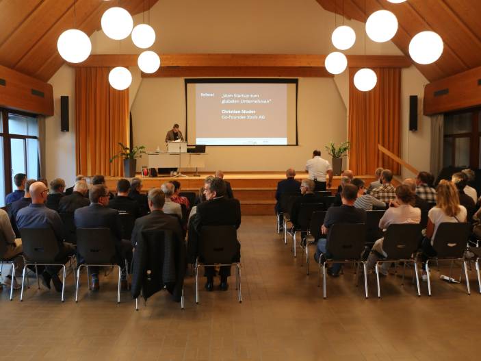 Mit seinem spannenden Referat zum Thema „vom Startup zum globalen Unternehmen“ traf Gastreferent Christian Studer, Co-Founder Xovis AG, auf grosses Interesse bei den anwesenden Gästen. Lebhaft und anschaulich erzählte er von den Anfängen, als drei innovative Männer eine Vision hatten und zusammen eine Firma gründeten, bis hin zu heute, wo die Firma mehr als 130 Angestellte hat und weltweite Marktführerin auf ihrem Gebiet ist. Und niemand kommt um ihr Produkt herum: weltweit sind Sensoren der Firma Xovis im Einsatz. Angefangen bei Flughäfen, Einkaufszentren, Fussballstadien, Städten, Kirchen, Zügen und Open-Air-Konzerten. Die Sensoren und die dazugehörige Software, welche anonymisiert Kundenströme messen, finden sich sowohl im Vatikan, auf zahlreichen Kreuzfahrtschiffen, namhaften Modegeschäften, dem Disney Park Paris oder dem Rock am Ring. Weltweit sind es mittlerweile 200'000 Sensoren, welche für geordnete Kundenströme und Sicherheit sorgen.